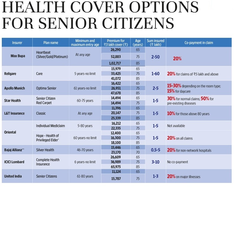 2- You can try Apollo Munich Optima Senior policy, Star Health Senior Citizen Red Carpet or Oriental's - Individual Medicalim or Hope - Health of Privileged Elder.