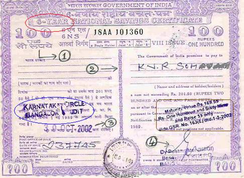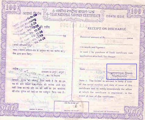 An example of NSC of Rs 100 is given below. The fitrst figure is the front portion and the second figure is back side of the same certificate -